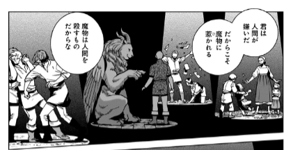 王様としてライオスはファリンの肉を皆に振る舞うことで、人間の輪に入ることができたのです。